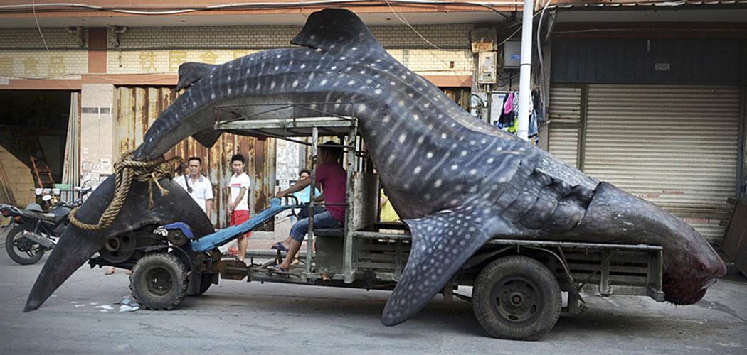 A whale shark being transported after it was caught in a fishermen's net in Yangzhi county, Fujian province. According to local media, the whale shark is five-metres-long and weighs over 2 tonnes.
