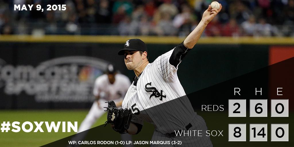 The White Sox star rookie pitcher Carlos Rodon had his first win in the big leagues as they beat the Cncinnati Reds 8-2