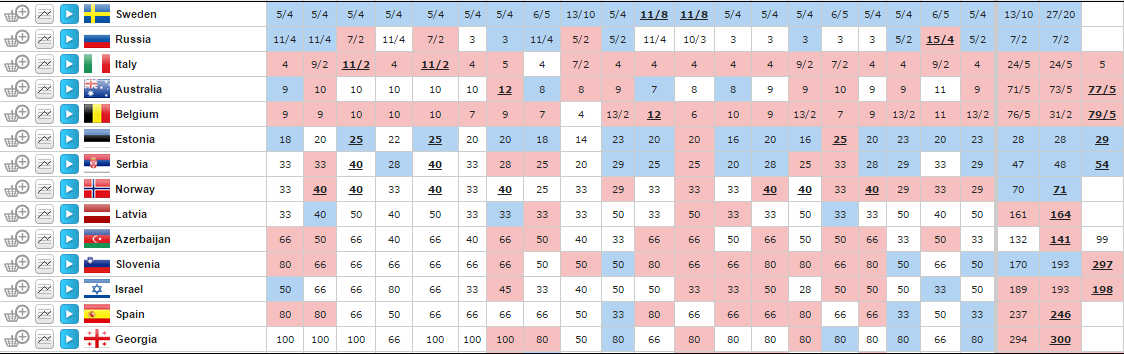 Russia e/w, Sweden at 5/2 with betfred, nul points for someone at 9/4