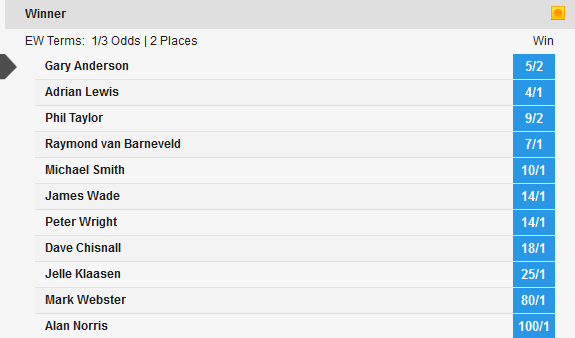 PDC World Championship RVB 40/1 20 £10 e/w 1/4 1,2,3,4