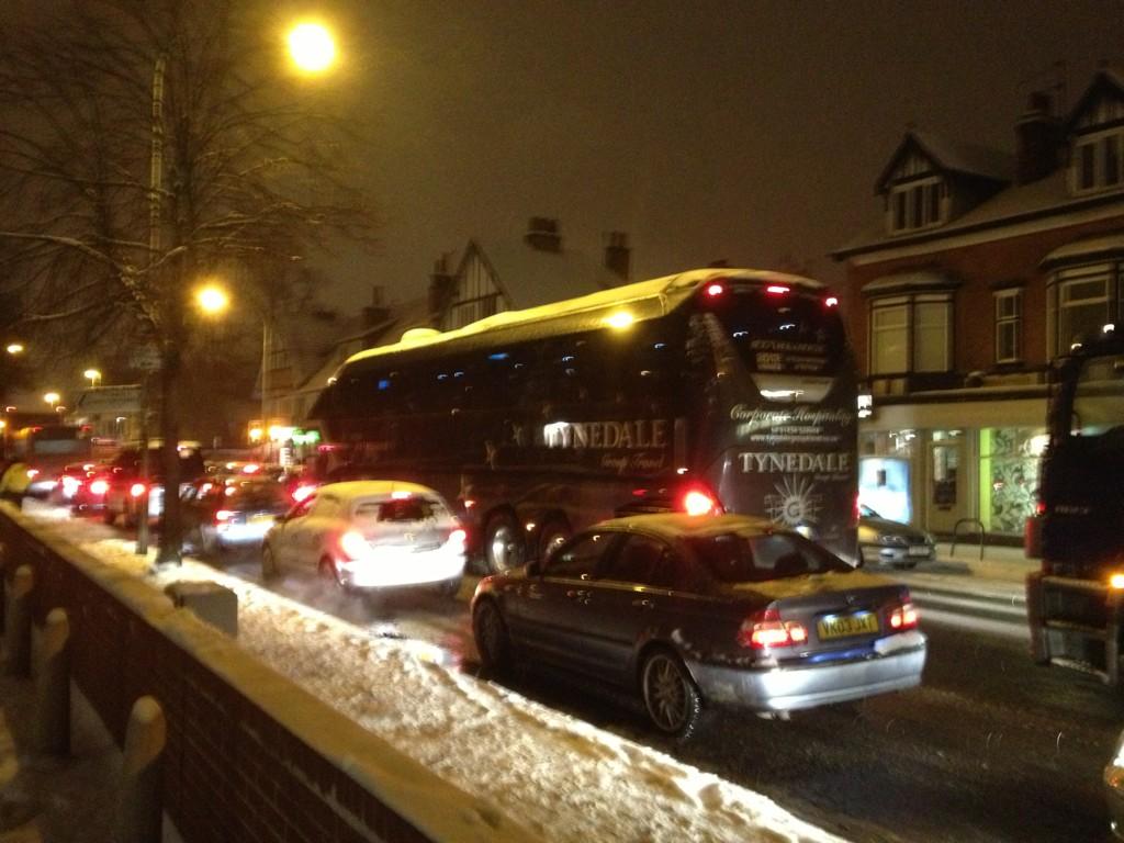 Middlesborough team coach stuck on the ungritted Narborough Road (main road into Leicester from Fosse Park direction)..
