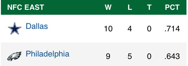 The Eagles lost 38-27 to Dallas and fell a game behind them in the NFC East. A salvation may be the Cowboys have to play the Colts next week, whilst thed Eagles end against the Giants and Redskins but as of now the Eagles are outside the play-offs