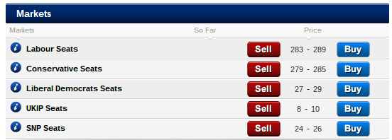 today's sporting index general election spreads...hung parliament is 2/5 currently