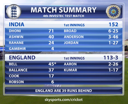 with England being in control at the end of the day. The innings equalled the test record of six ducks in an innings.