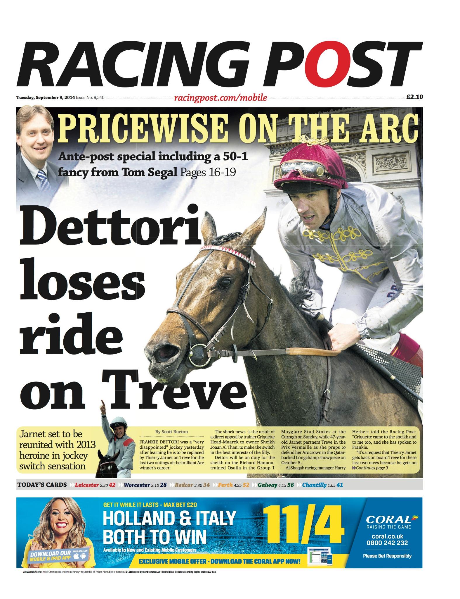 News from France that Frankie Dettori has been jocked off Treve. We have a variety of bets, Arc related mostly, on Treve who is coming back from injury....to win the arc, to win the arc by 2+ lengths, to win three group 1's in 2014. I think she has a prep race this weekend coming up