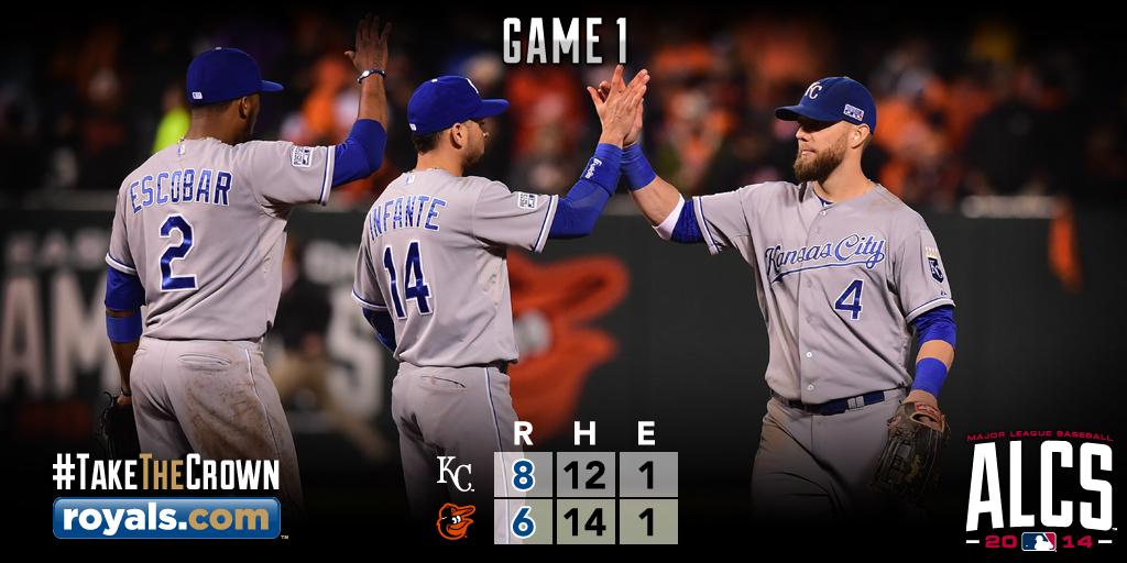 8-5 ahead, closer Greg Holland came in, gave up a run and with two further potential runs on base struck out the last batsman to give the Royals the first game of the seven game series 8-6