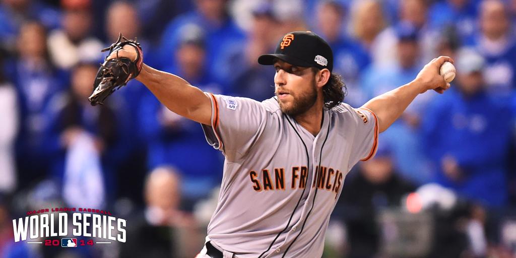 At the start of the fifth inning, the Giants introduced their ace pitcher Madison Bumgarner, three days after he shut out the Royals in game 5.