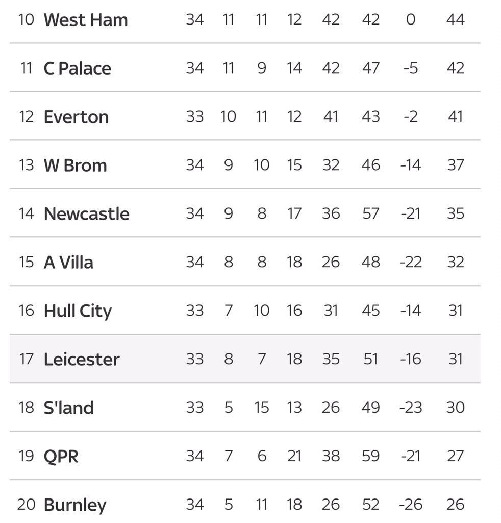 - Leicester, a fourth win in a row took them out of the back of three and delayed the loser on the top half bet for another few days. Burnley now bottom, having not scored for 8 hours of Premier league play