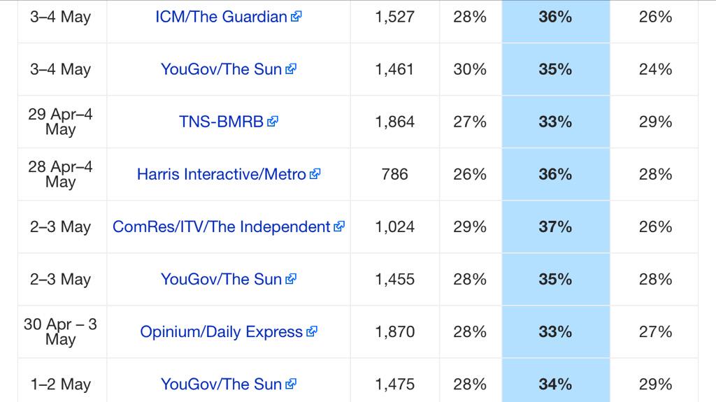 yesterdays' poll was 33-33 con-lab and con needs to be a minimum of 1.5-2% ahead on thursday to win most seats