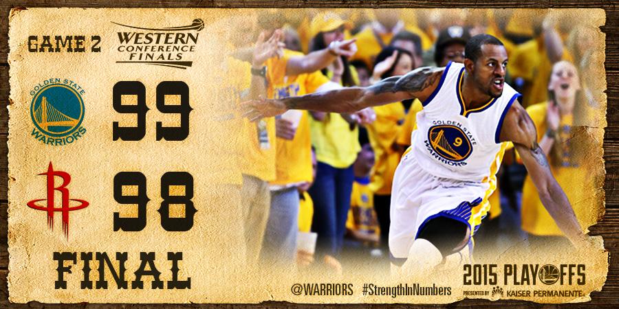 Golden State Warriors beat Houston Rockets 99-98 to go 2-0 up in the best of 7 conference finals. Teams with 2-0 leads in best-of-7 NBA play-off series have gone on to win 94% of time