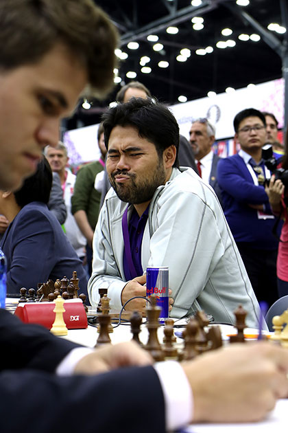 Not many were expecting him to do this in Round 9 against the USA's Fabiano Caruana, though. Certainly not USA board 2, Hikaru Nakamura, whose face did this when he saw Magnus's Scandinavian defence: