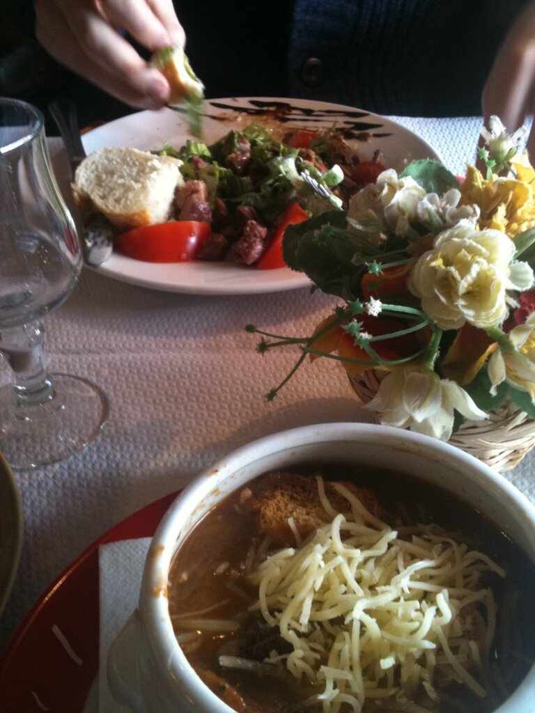 I have had a very nice fish soup and Ed chose the duck gizzards washed down with a ' pichet' of white wine.