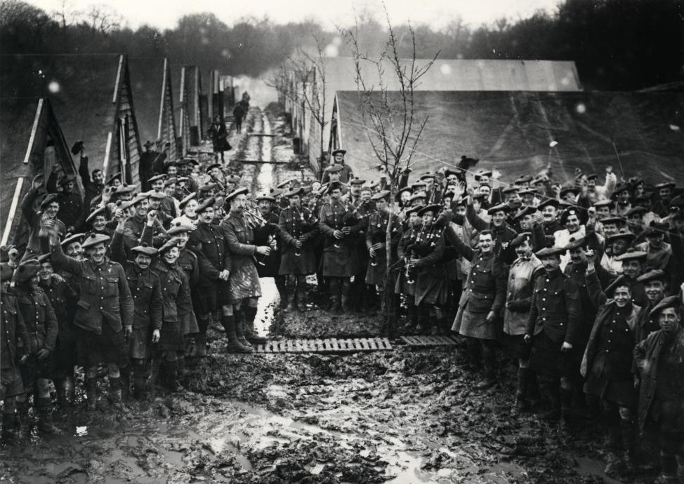 Two disabled soldiers on the grounds of the 4th London General Hospital. The original caption reads "Are we downhearted?". ca 1916.