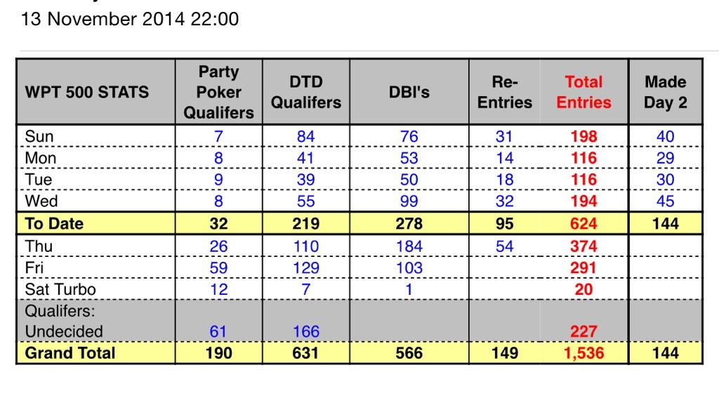 WPT 500 Wednesday Update: 194 entries today taking us to a total of 624, needing a massive 1376 before Day 2 starts on Saturday. Friday will be the make or break day as usual - we have no capacity problems with 75 tables at our disposal - so please do not worry about being turned away-we added the extra capacity for this very reason - so we could break our attendance record at the Club. Can we hit the 2000?