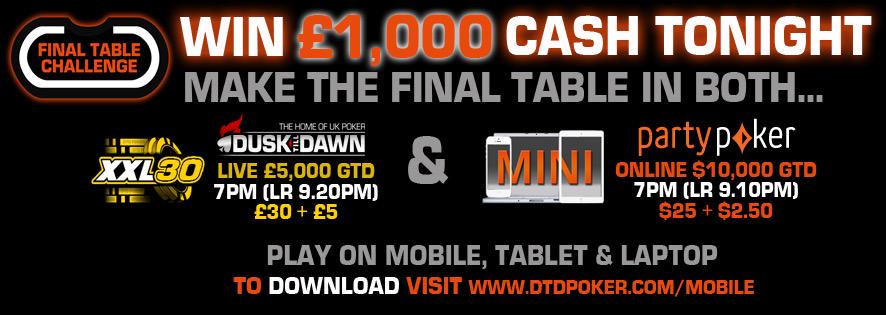 XXL 30 players - play the DTD Mini on the partypoker APP - get £1k cash if you final table both