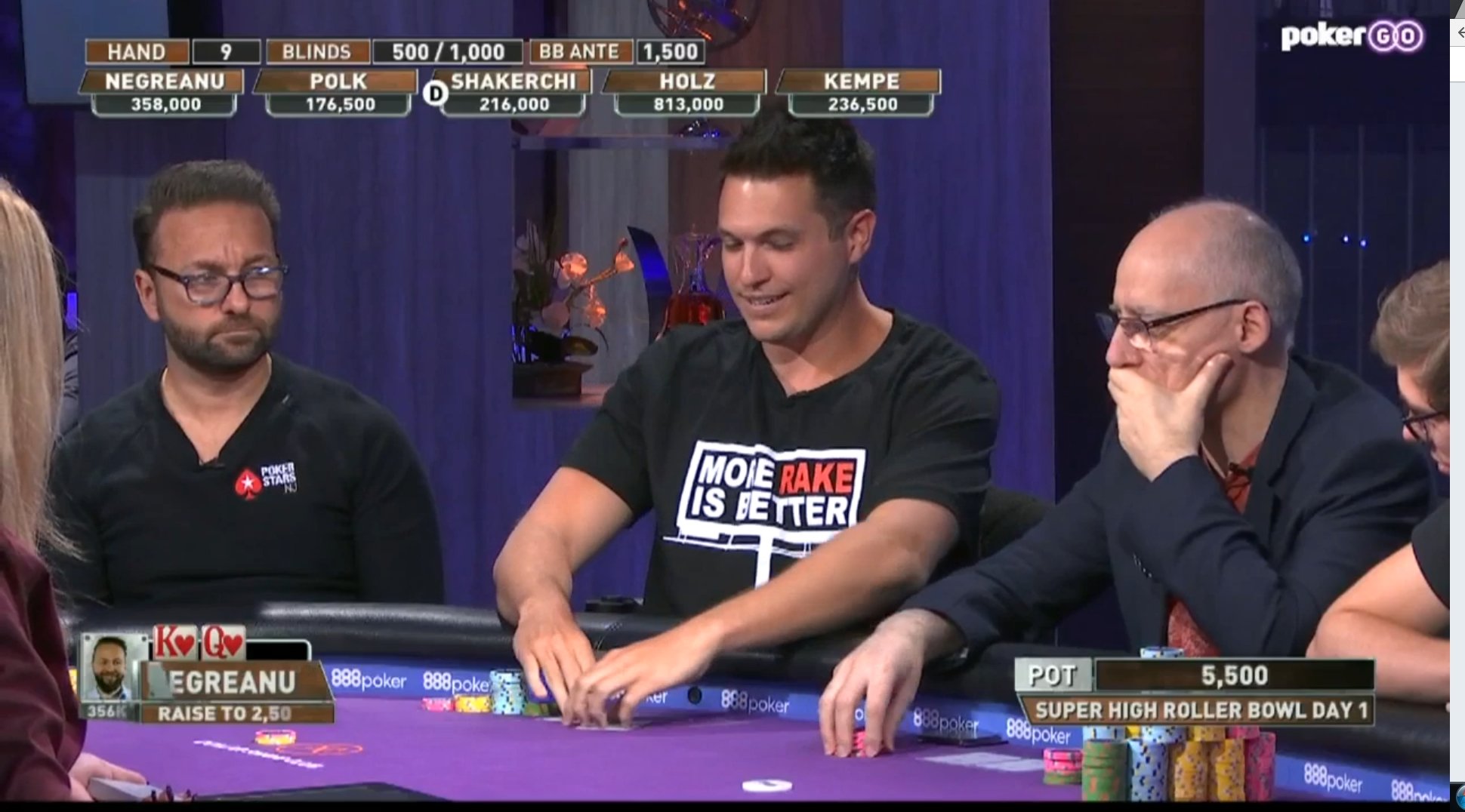 Doug Polk sits next to Negreanu at the super highroller bowl, and gets himself a new t-shirt for the occasion.