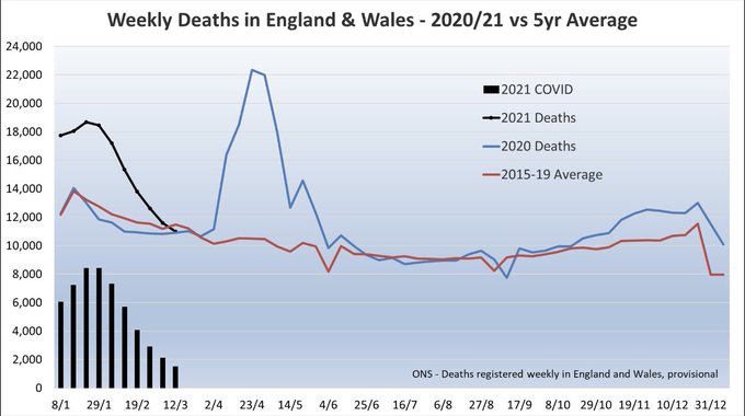Cliffs: Deaths falling amongst vaccinated groups and overall deaths are now BELOW average.